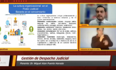 La disertación estuvo a cargo del doctor Miguel Alan Puente Harada, exjefe del Gabinete de Asesores del Poder Judicial y actual responsable técnico del Programa Presupuestal 067 “Celeridad en los Procesos Judiciales de Familia”.