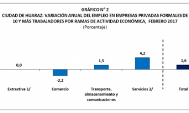 Mientras que en Huaraz, la variación positiva anual del empleo en la ciudad de Huaraz fue impulsada principalmente por la rama de actividad económica servicios (4,2%), debido al buen desempeño del empleo en las subramas servicios prestados a empresas, enseñanza y servicios sociales y comunales.
