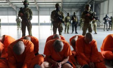 De uniforme naranja, manos atadas y con la cabeza rapada mirando al piso, una veintena de detenidos aparecen sentados en el suelo y rodeados de militares de rostro cubierto, según imágenes difundidas por el mandatario en X.