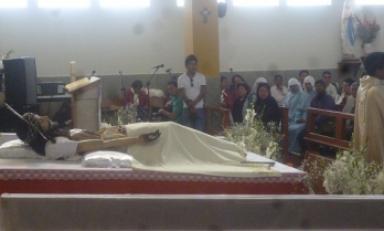 La imagen del Cristo yaciente fue bajado de la cruz para ser colocado en una enorme tarima y luego envuelto con sábanas y telas para quedar expuesto en medio del altar mayor.