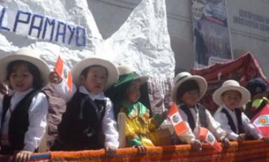 Los infantes pertenecientes a los centros de educación inicial se presentaron con sus vistosos carros alegóricos con motivos regionalistas entre ellos los recursos naturales, pasajes de la historia ancashina así como las diferentes estampas de baile y danza.