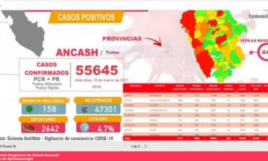 La DIRESA informó que a la fecha se han contagiado del temible virus 55 mil 645 pobladores, 47 mil 301 se han recuperado, 2 mil 642 perdieron la vida, se infectaron 158 distritos de Áncash y la letalidad es de 4.7 por ciento. (Redacción Central)
