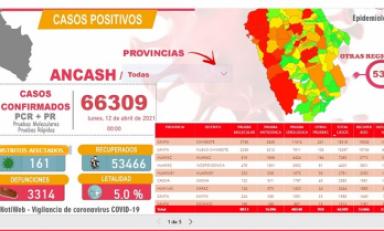 Huaraz en Línea. – La Dirección Regional de Salud de Áncash (DIRESA) reportó hoy 24 nuevos fallecidos a causa del nuevo coronavirus en esta región donde los contagios suman 66,309, los recuperados 53,466 y la letalidad aumentó a 5%.