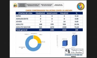 La Dirección Regional de Salud de Áncash (DIRESA) reportó que durante la pandemia han muerto 2 mil 142 pacientes, de los cuales tres eran niños, 14 jóvenes, 526 adultos y 1,599 adultos mayores.