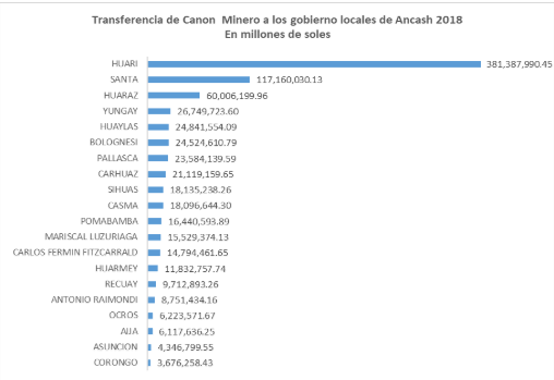 A nivel de la Región Ancash, la Municipalidad Distrital de San Marcos (Huari) sigue siendo la municipalidad con las mayores transferencias de canon minero, recibió 161,834,439.14, seguido de la Municipalidad Provincial del Santa Chimbote con 46,137,259.09 de soles y la Municipalidad Distrital de Chavín de Huántar con 43,488,519.86de soles.