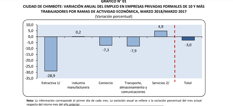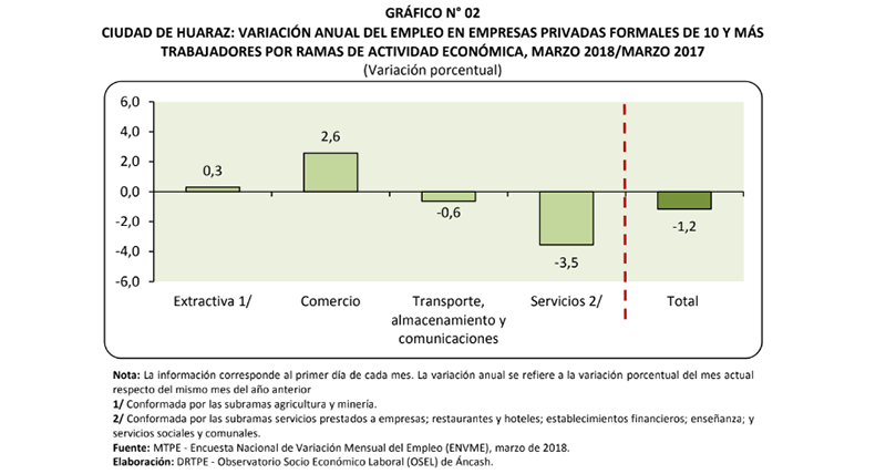 Huaraz en Línea.- El empleo en empresas privadas formales de 10 y más trabajadores en las ciudades de Chimbote y Huaraz registró una variación negativa de 3,0% y 1,2% respectivamente, en marzo de 2018, respecto del mismo mes del año anterior.
