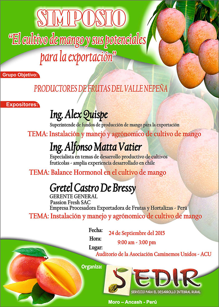 Huaraz en Línea.- Con el objetivo de contribuir al desarrollo de capacidades en los productores de mango en el distrito de Moro y el valle de Nepeña, el Servicio para el Desarrollo Integral Rural (SEDIR) realizará el simposio: “El cultivo del mango y sus potenciales para la exportación”; dirigido a los productores de mango, agricultores en general, empresarios agroexportadores y estudiantes de agronomía.