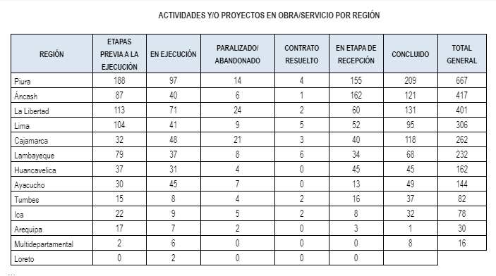 De setiembre de 2017 a noviembre de 2019, se identificaron 442 obras y servicios en ejecución (16%), 104 paralizadas y abandonadas (4%), 589 en etapa de recepción (21%) y 25 con contratos resueltos (cancelados 0.9%).