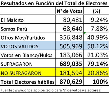 Bajo este enfoque la primera fuerza política en la Región tras las justas regionales al 100% de actas procesadas solo ha obtenido el 9.24% del total de electores hábiles, un poco menos de la décima parte del electorado hábil, por debajo del porcentaje de votos nulos(9.6%), por debajo del porcentaje de votos en blanco (11.47%) y lejos del porcentaje de los que se abstuvieron de votar (20.86%) que incluso representan más de la suma delas dos fuerza que pasaron a la segunda vuelta.