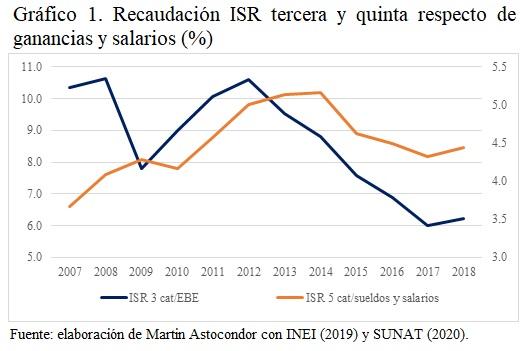 La recaudación tributaria por el impuesto a la renta a las actividades empresariales de personas naturales y jurídicas (tercera categoría) es cada vez menor en el tiempo. En el gráfico 1 se ilustra el cociente de la recaudación total respecto del total de las ganancias de la economía (excedente bruto de explotación) entre 2007 y 2018. Antes pagaban el 10.4% de sus ganancias, con un valor máximo de 10.6% en 2012 y ahora contribuyen con solo el 6.2% en 2018. En 2017 se tuvo un valor mínimo de 6%. Por otra parte, la recaudación del impuesto a la renta a trabajadores dependientes (quinta categoría) ha sido menor que la relativa a las actividades empresariales, pero muestra una ligera tendencia creciente desde un valor equivalente al 3.7% del total de sueldos y salarios pagados en la economía en 2007 hasta 4.4% en 2018. Los asalariados tienden a contribuir más a la recaudación tributaria. ¿Es esto equitativo?