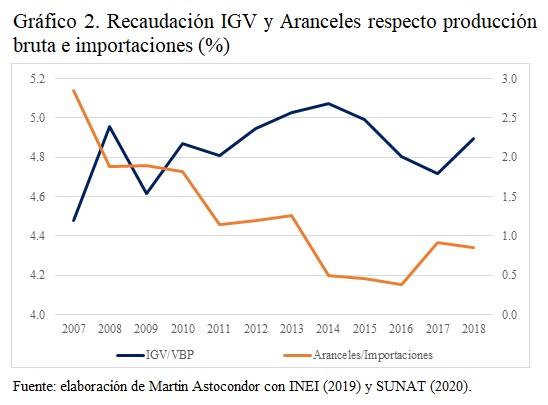 En el gráfico 2 se muestra como la recaudación por el IGV se mantiene, aunque fluctuando cercana al 5% de la producción bruta o valor bruto de la producción (VBP) con una mayor aportación relativa en 2014 y menor en el 2009. En 2018 fue equivalente al 4.9% de la producción total. Un mecanismo alternativo a la tasa IGV del 18% consistiría en aplicar una tasa general entre el 5% o el 6% sin posibilidad de deducción alguna facilitando la recaudación y fiscalización.