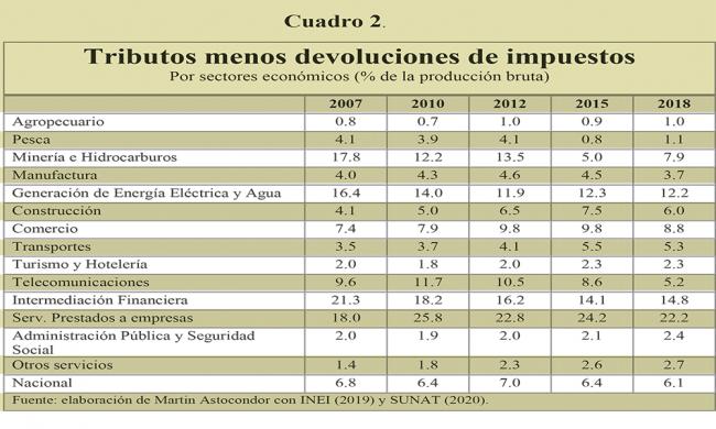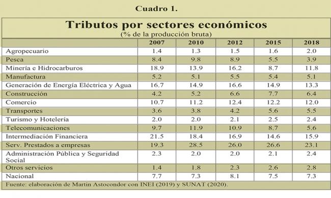En el cuadro 1 se aprovecha la información de la recaudación por tributos internos clasificada sectorialmente por la SUNAT en actividades económicas, según la Clasificación Industrial Internacional Uniforme. Al mismo tiempo estos resultados se expresan respecto del valor de la producción bruta sectorial calculada por el INEI. Estos resultados son útiles para determinar cuáles son las actividades económicas que contribuyen más o menos a los ingresos públicos. Hay sorpresas interesantes.