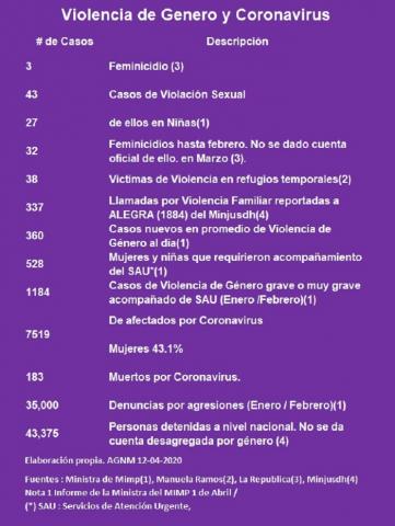 Por su parte, la Ministra de la Mujer y Poblaciones Vulnerables (MIMP), Gloria Montenegro presentó en la misma fecha cifras parciales de la violencia de género, producidas en la primera quincena de la cuarentena del coronavirus. Tenemos que alertar que en ello hay un subregistro. Es conocido que hay cifras ocultas de casos que no son reportados por las víctimas, tanto por temor como por la imposibilidad de denunciar en este momento, en plena cuarentena.