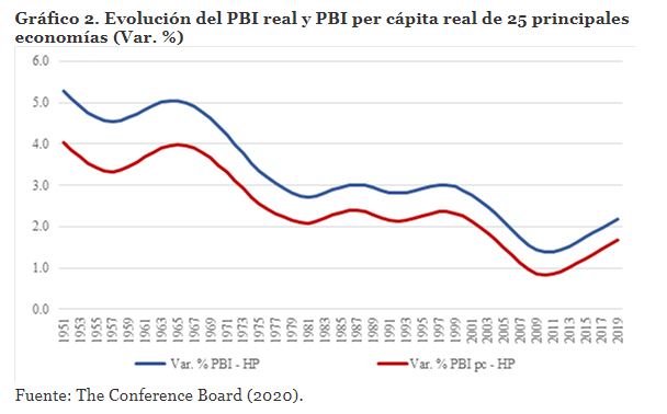 Muchos se ufanan del crecimiento económico de las últimas décadas para afirmar que este modelo neoliberal es plenamente exitoso. Están mintiendo o les falta perspectiva de largo plazo. Si se revisan las series estadísticas desde 1950 a 2019 las conclusiones serían diferentes. En el gráfico 1 se muestra la tasa de crecimiento promedio del PBI y PBI per cápita de las 25 principales de economías del mundo.
