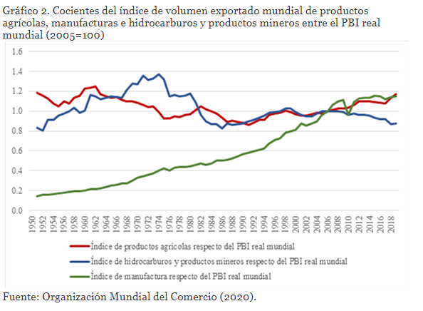 El mundo demanda más manufacturas en la medida en que el producto aumenta (tiene una elasticidad ingreso mayor a uno). Hay que exportar lo que el mundo necesita. En cambio, en el caso de los hidrocarburos y los productos mineros hay una tendencia fluctuante y que se convierte en decreciente a partir de finales de la primera década del siglo XXI. Entre los años 50 y 70 el crecimiento económico mundial fue más intensivo en el uso de hidrocarburos y de nuestros productos mineros; también fue ligeramente más intensivo en la década de los 90. El comercio internacional de productos agrícolas fue relativamente importante en los años 60, para de ahí estabilizarse y a partir del siglo XXI hay una tendencia ligeramente creciente que estamos aprovechando en el caso de la exportación no tradicional de productos agropecuarios.