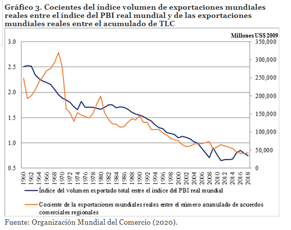 En el gráfico 3 se muestra que está ocurriendo con el comercio internacional respecto del PBI mundial real desde los años 50 a la fecha. También se observa cual es la aportación marginal de los TLC a nivel a global, misma que se estima como el cociente del valor de las exportaciones mundiales respecto del número acumulado de estos acuerdos regionales o internacionales. Se extraen igualmente conclusiones interesantes. Del lado izquierdo se observa la desaceleración de la importancia del comercio internacional respecto del producto mundial. En particular cuando el cociente adquiere valores por debajo de la unidad desde el segundo quinquenio del siglo XXI. El crecimiento del PBI se está acompañando de un menor crecimiento del comercio internacional. Las economías están mirando relativamente más hacia adentro que hacia afuera. El proceso de desglobalización está en curso y hacia adelante, por la crisis, las economías se cierran y ven más por sus propios intereses.
