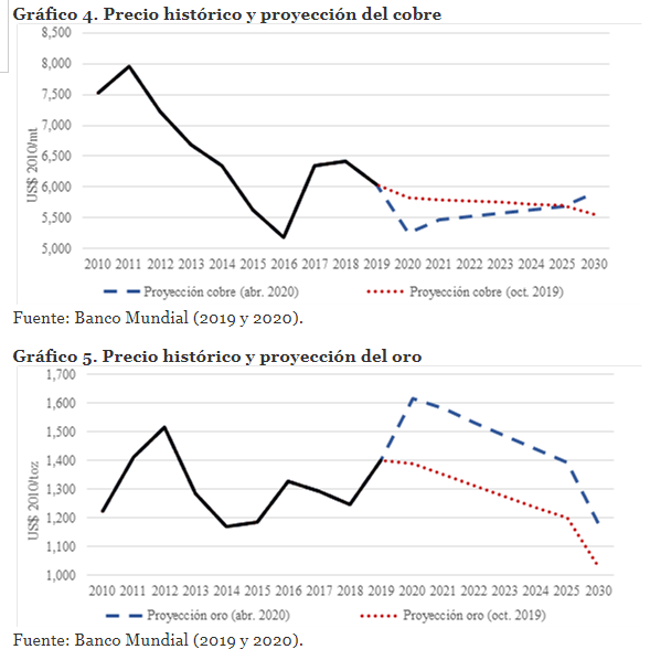 En los gráficos 4 y 5 se muestran las proyecciones de los precios internacionales de algunas de nuestras materias primas, en particular del cobre y el oro. Son los estimados del Banco Mundial de octubre de 2019 y abril de 2020 hasta el año 2030. Están en dólares constantes de 2010 presentando la información histórica entre 2010 y 2019. La data no es alentadora en el caso de nuestro producto emblemático del cobre; tampoco lo sería en los casos del hierro, plata y plomo. Solo mostraría una tendencia ligeramente positiva en el zinc, pero en ningún caso arribarían a los niveles de precios máximos de los años 2010-2011.