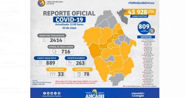 Según el reporte de la Dirección Regional de Salud de Áncash (DIRESA), en esta región se han procesado 2,414 muestras, de las cuales dieron positivo 809, 889 negativo, en espera 713, 263 hospitalizados y 33 recuperados.