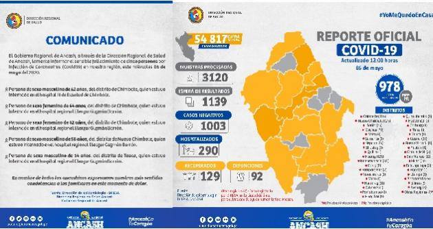Huaraz en Línea. – Cinco personas fallecieron con coronavirus en Áncash, aumentando las víctimas mortales a 92, en una región donde se han reportado hasta hoy 978 casos confirmados, entre pruebas moleculares y rápidas.