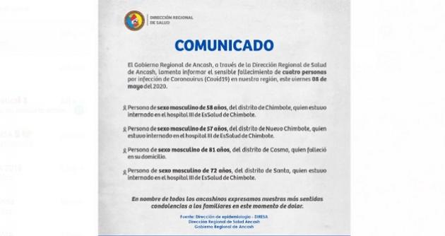 Huaraz en Línea. – La Dirección Regional de Salud confirmó la muerte de cuatro varones en la zona costa de Áncash, aumentando a 106 el número de fallecidos por coronavirus a 106 en esta región.