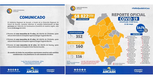La Diresa comunicó también el lamentable deceso de tres varones de 73, 55 y 65 años, los dos primeros de Chimbote, quienes murieron en el Hospital Regional Eleazar Guzmán Barrón de Nuevo Chimbote. Y la tercera víctima era de Huaraz y dejó de existir en el Hospital Víctor Ramos Guardia.