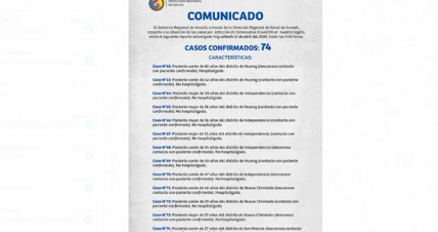 Huaraz en Línea. – A 74 se han elevado los casos confirmados de Covid 19, en la región Áncash. Cinco provienen del distrito de Independencia, cuatro de Huaraz, tres de Nuevo Chimbote y uno del distrito de San Marcos.