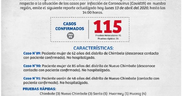 Los nuevos casos confirmados (moleculares) son: el 89 se trata de una mujer de 62 años de Chimbote, el 90 es también una mujer de 85 de Nuevo Chimbote y el 91 es un varón de 48 también de Nuevo Chimbote que tuvo contacto con un caso confirmado.