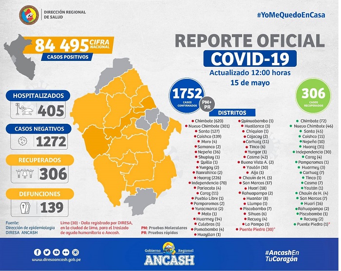Huaraz en Línea. - El coronavirus hasta hoy ha causado lamentablemente la muerte de 139 pacientes en Áncash y se han recuperado 306 en una región donde se han confirmado 1,752 casos de la pandemia.