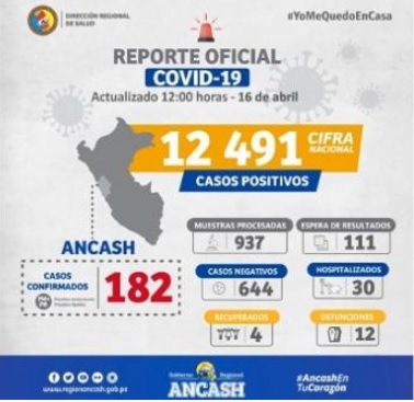 Según datos actualizados hoy al mediodía, en Áncash se han registrado 182 casos confirmados de Covid-19, 111 están pendiente de resultados, 30 se encuentran hospitalizados y cuatro se recuperaron. (Redacción Central)