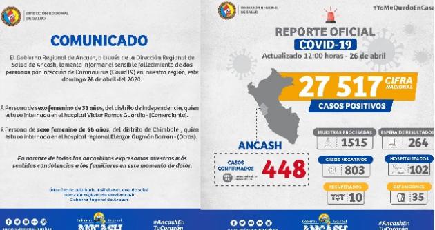 Huaraz en Línea. – La Dirección Regional de Salud informó que dos mujeres fallecieron con coronavirus en Áncash, aumentando a 35 las víctimas mortales en esta región.