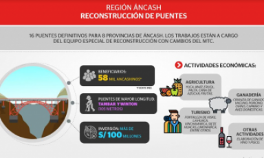 Huaraz en Línea.- El Ministerio de Transportes y Comunicaciones (MTC), a través de su Equipo Especial de Reconstrucción con Cambios (EERCC), invierte más de S/ 100 millones en la instalación de 16 puentes definitivos que mejorarán la transitabilidad de 58 mil ciudadanos ancashinos.