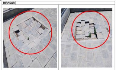 Se constató que las maderas instaladaspresentan agrietamientos, pandeos en su longitud y hongos. En el mirador se encontraron lajas desprendidas en diferentes paredes y hundimiento en los pisos instalados; advirtiéndose una indebida compactación de la zona que requerirá la demolición de la estructura del mirador y del relleno.