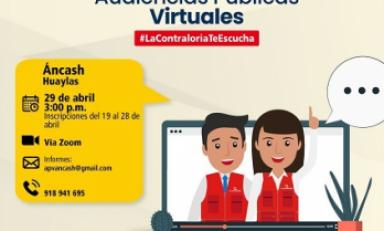 En el caso de la provincia de Huaylas, la Audiencia Pública Virtual se realizará el viernes 29 de abril y las inscripciones estarán abiertas hasta el jueves 28; para participar deberán ingresar al siguiente enlace: https://forms.gle/Zw8tQ6zRxizq2kcXA o ingresar al portal www.gob.pe/contraloria.