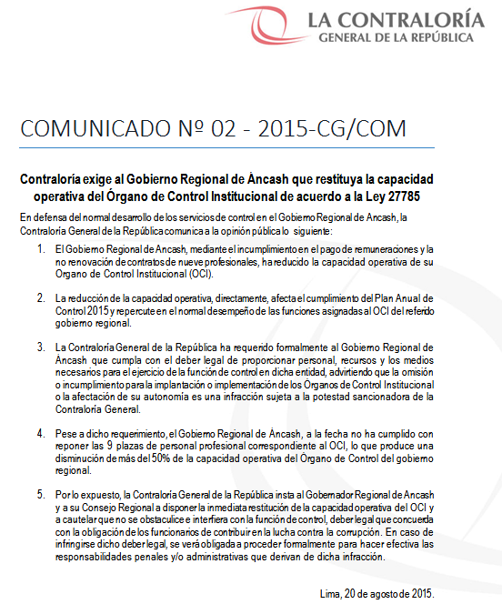 Huaraz en Línea.- A través del comunicado N°02-2015-CG/COM la Contraloría General de la Republica exige al Gobierno Regional de Áncash (GRA) que restituya la capacidad operativa del Órgano de Control Institucional de acuerdo a la Ley 27785, en defensa del normal desarrollo de los servicios de control en esta sede gubernamental.