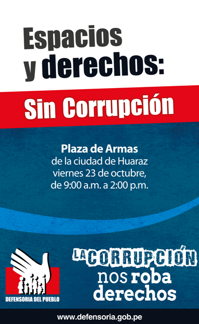 Huaraz en Línea.- La Defensoría del Pueblo desarrollará mañana la feria informativa sobre lucha contra la corrupción denominada "Espacios y Derechos sin Corrupción". La jornada iniciará a las 9 de la mañana en la Plaza de Armas de la ciudad de Huaraz.