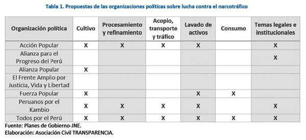 Transparencia, usando su herramienta digital Compara Ya, nos presenta un resumen comparativo de los los planteamientos de las organizaciones políticas que participan en las Elecciones Generales 2016, referidos a a lucha contra el narcotráfico; siguiendo la cadena del narcotráfico, añadiéndole al final una columna relacionada con propuestas de naturaleza institucional y normativa.