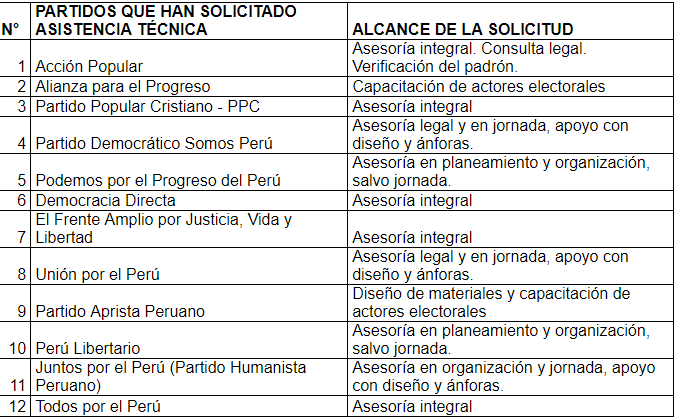 El apoyo y asistencia técnica solicitada a la ONPE por los doce partidos mencionados tiene las siguientes características: