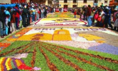 El Domingo de Ramos, desde la madrugada, se elaboran las alfombras florales en las calles de la ciudad por las cuales pasará la procesión. En su confección son usados pétalos de flores, plantas y arbustos de la zona, entre otros. El conjunto de alfombras florales llega a medir varios kilómetros. Existe la creencia local de que una vez que la procesión pasa sobre las alfombras, las flores y plantas con las que estas fueron confeccionadas se convierten en curativas de diversos males propios de la zona, tales como el susto y el mal viento.