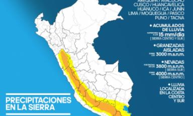 Según el pronóstico, se esperan nevadas en localidades sobre los 3,800 metros en la sierra sur y sobre los 4,000 metros sobre el nivel del mar en la sierra centro.
