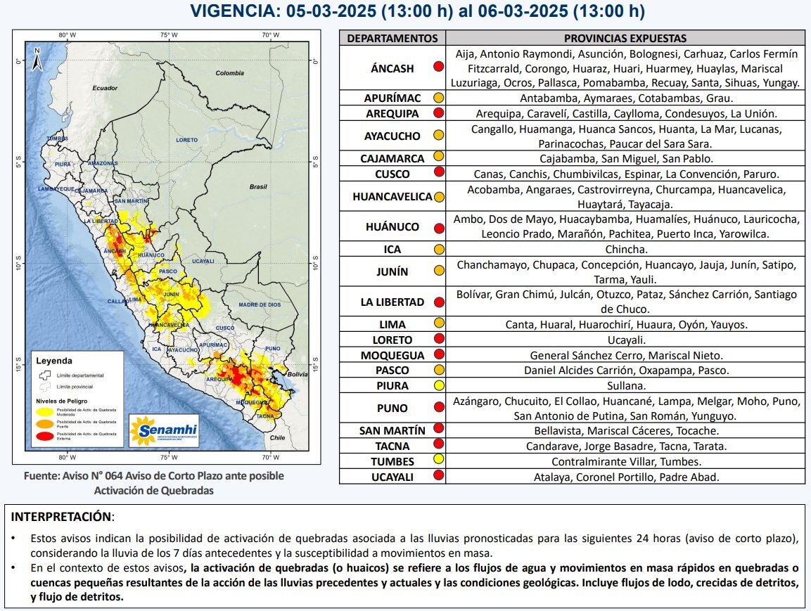 De acuerdo con su aviso de corto plazo N° 064-2025, emitido este miércoles 5 de marzo, existen altas probabilidades de que ocurra una activación de quebradas, las cuales estarían asociadas a las precipitaciones pronosticadas para las siguientes 24 horas.