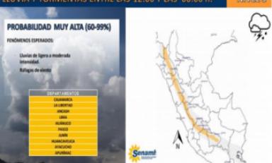 Según estos pronósticos las precipitaciones se presentarían en los departamentos de Cajamarca, La Libertad, Áncash, Huánuco, Pasco, Lima, Junín, Huancavelica, Ayacucho y Apurímac.