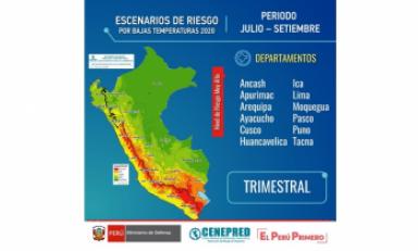 Del mismo modo, el Escenario de Riesgo por Bajas Temperaturas, elaborado por el CENEPRED, a partir de los pronósticos del Servicio Nacional de Meteorología e Hidrología (Senamhi), identificó 20,673 centros poblados expuestos a riesgo alto, distribuidos en 16 departamentos, que comprenden una población de 2´001,507 habitantes; 612,726 viviendas; 1,408 establecimientos de salud y 8,375 instituciones educativas.