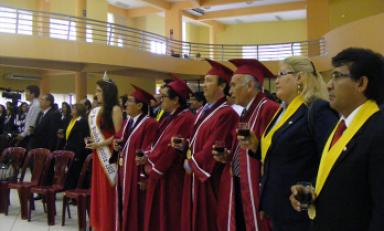 El gran auditorio estuvo abarrotado de estudiantes, profesores, administrativos y las autoridades universitarias; quienes participaron, a primera hora, del izamiento de la Bandera Nacional en la Plaza 28 de Julio y la misa de aniversario al interior del recinto.