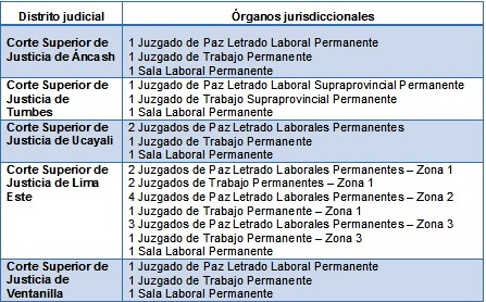 Los nuevos órganos jurisdiccionales son 13 Juzgados de Paz Letrado Laboral Permanente, siete Juzgados de Trabajo Permanente, cinco Salas Laborales Permanentes, un Juzgado de Paz Letrado Supraprovincial Permanente y un Juzgado de Trabajo Supraprovincial Permanente.