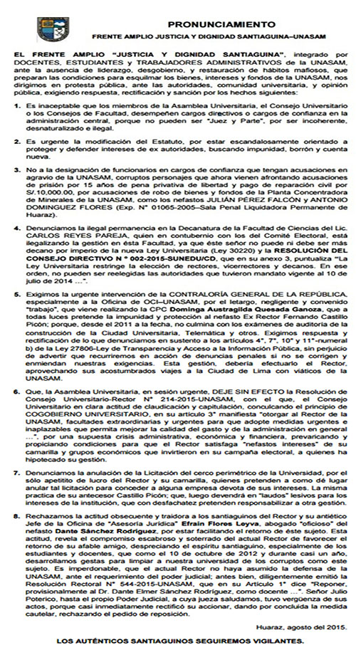 Huaraz en Línea.- A través de un pronunciamiento público el Frente Amplio Justicia y Dignidad Santiaguiña exigen la urgente intervención de la Contraloría General de la República a la Oficina de Control Interno (OCI) de la Unasam a cargo de Dominga Quesada Ganoza, debido a los hechos irregulares que se estarían registrando en la referida casa supeior de estudios.