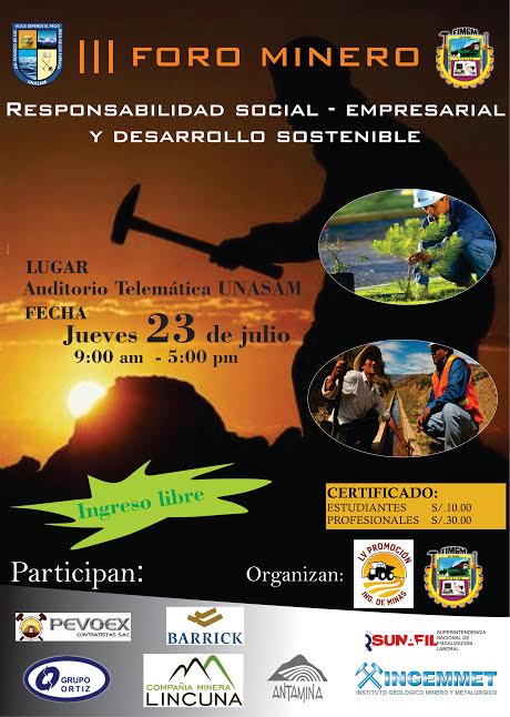 Huaraz en línea.- Con el fin de dar a conocer el impacto económico, social y ambiental del accionar de las empresas mineras, la Universidad Nacional Santiago Antúnez de Mayolo (Unasam), realizará el III Foro Minero “Responsabilidad Social Empresarial y Desarrollo Sostenible”.