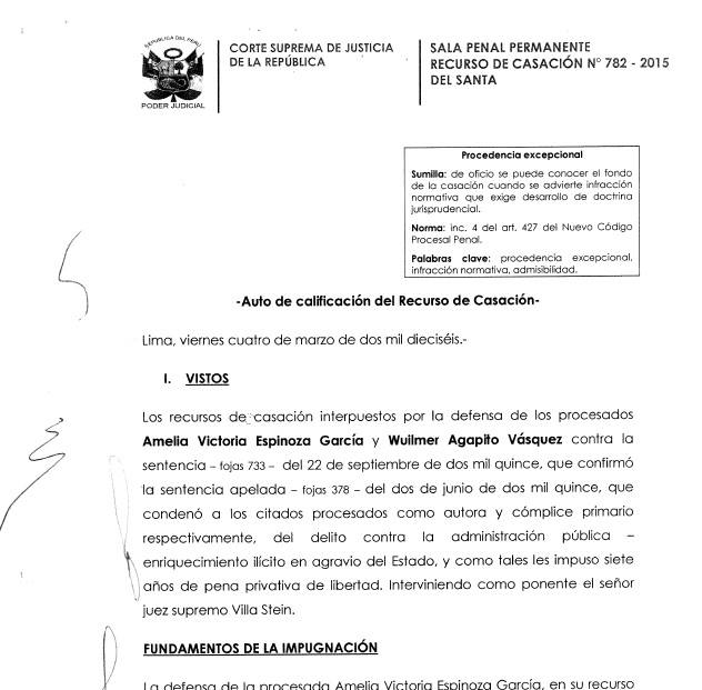 El recurso de casación N° 782-2015 pretende dejar sin efecto la sentencia en segunda instancia, emitida por la Sala Penal de Apelaciones de la Corte Superior de Justicia del Santa el 22 de setiembre del año pasado, la cual ratificó una condena de 7 años de prisión contra Espinoza y Agapito por enriquecimiento ilícito en agravio del Estado.
