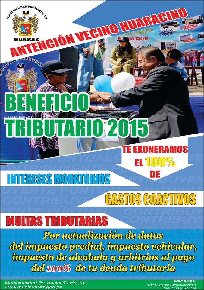 Huaraz en Línea.- La exoneración del 100% de intereses moratorios, multas tributarias y gastos coactivos ofrece la Municipalidad Provincial de Huaraz a contribuyentes que realicen su declaración jurada de actualización de datos y efectúen el pago al contado del 100% de la deuda tributaria.