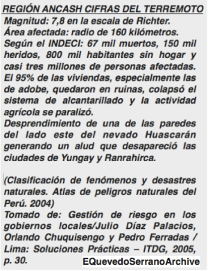 Huaraz en Línea.- (Por: Eduardo Quevedo Serrano) La tarde del 31 de Mayo de 1970 transcurría en Chimbote como un domingo cualquiera. La gente disfrutaba de un día soleado. No había sospecha que a las tres y veintitrés un terrible terremoto destruiría la obra humana con mortal ferocidad, como si la naturaleza hubiera querido arrojar por los suelos todos los huesos de la ciudad para averiguar, entre sus escombros, de qué acero estaba hecho el carácter de su pueblo.