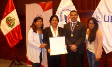 El diploma y la medalla fue entregado por el decano del Colegio de Periodistas de La Libertad (CPLL), Alberto Pinillos, a la directora ejecutiva de Perú en Línea, Nora García Vásquez; quien recibió la distinción a nombre del equipo de periodistas de los portales de Chimbotenlinea.com, Huarazenlinea.com, Trujilloenlinea.pe, Chiclayoenlinea.com, Piuraenlinea.com, Icaenlinea.pe y Huancayoenlinea.com